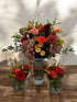 Fleurs principales : Roses pêche et jaunes, lys, gerberas rouges, solidago, et autres fleurs saisonnières. Feuillage : Eucalyptus et verdure variée. Idéal pour : Décorer une table de réception, un anniversaire ou toute célébration nécessitant une ambiance joyeuse et accueillante.