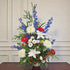 Composée d’un harmonieux mélange de lys blancs, chrysanthèmes, gerberas rouges, fleurs bleues et de verdure luxuriante, cette création florale évoque à la fois la paix, le respect et la sincérité.