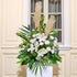 Élégante et apaisante, cette corbeille funéraire blanche évoque la pureté, le respect et la sérénité. Composée de lys, de roses, de marguerites et de feuillages luxuriants, elle rend hommage avec délicatesse et sobriété, tout en exprimant des sentiments sincères de réconfort et de compassion.