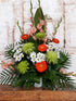 - Fleurs principales : Gerberas orange, chrysanthèmes verts, marguerites blanches, gladiolus roses.