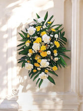 Cette gerbe funéraire, composée de fleurs jaunes et blanches, est un hommage lumineux et plein de respect. Les couleurs vibrantes du jaune symbolisent l'espoir et la lumière, tandis que le blanc représente la paix et la pureté, créant une composition qui apporte un message de réconfort et de souvenir.