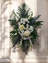 Cette gerbe funéraire, composée de fleurs blanches et bleues, est un hommage apaisant et plein de grâce, conçu pour exprimer le respect et la sérénité. Chaque fleur a été sélectionnée pour sa beauté intemporelle, apportant un message de paix en ces moments solennels.