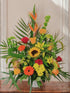 • Fleurs principales : Tournesols rayonnants, roses rouges profondes, roses orangées délicates, gerberas lumineux, lys jaunes éclatants, et oiseaux du paradis exotiques, apportant une touche majestueuse et symbolisant la liberté et la grandeur.